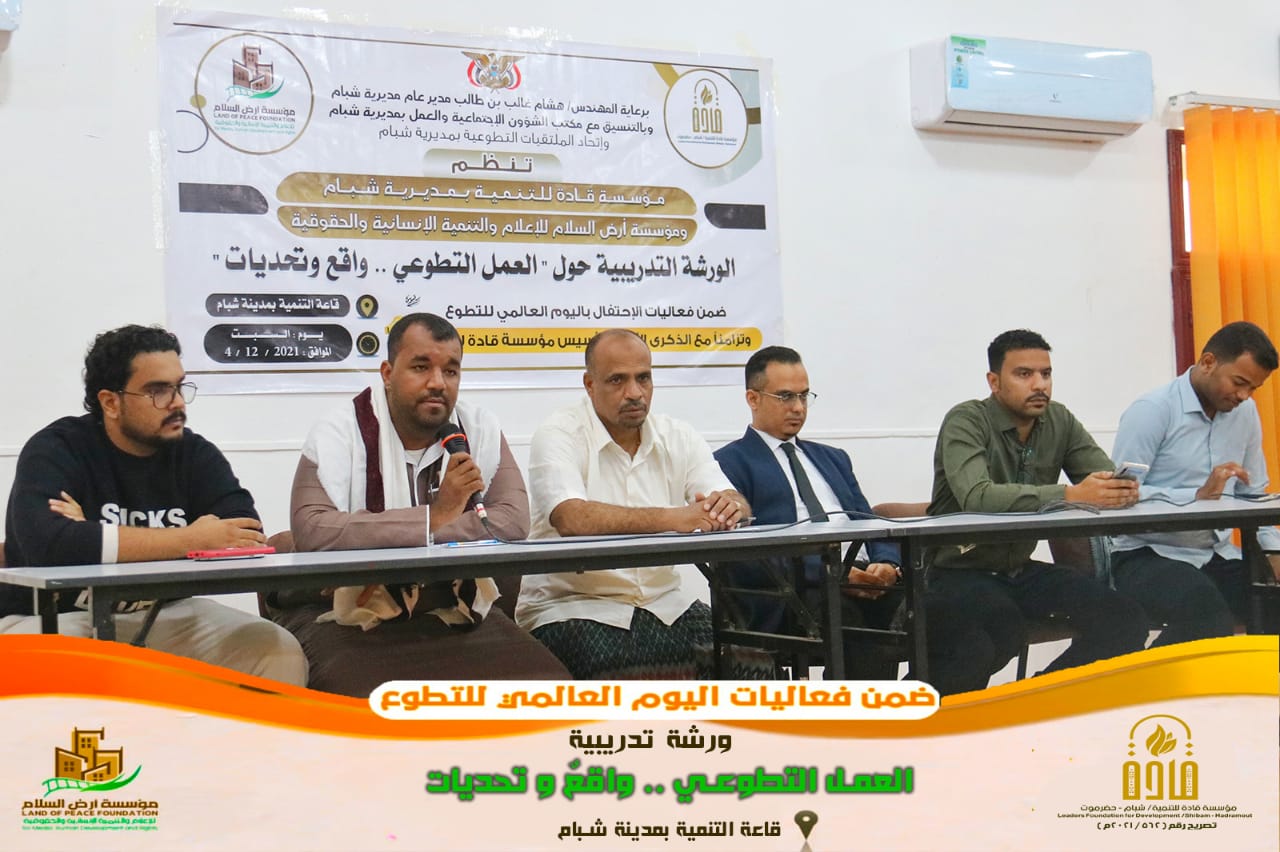 احتفاءً باليوم العالمي للتطوع مؤسسة أرض السلام للإعلام والتنمية الإنسانية والحقوقية ومؤسسة قادة للتنمية تنظمان ورشة تدريبية بعنوان “العمل التطوعي واقع وتحديات”