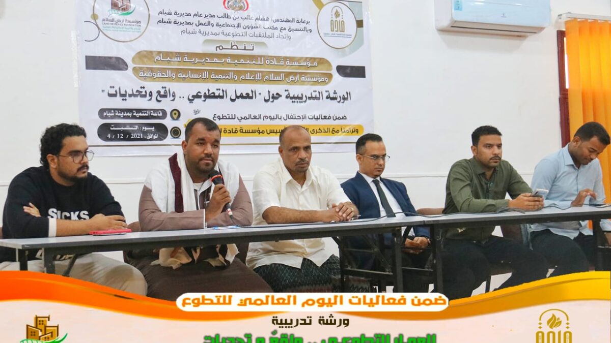 نظمت مؤسسة قادة للتنمية و مؤسسة أرض السلام للإعلام والتنمية الإنسانية و الحقوقية ورشة تدريبية صباح السبت 4 ديسمبر 2021م لمؤسسات وملتقيات المجتمع المدني بمديرية شبام وذلك تزامناً مع الاحتفاء باليوم العالمي للتطوع.