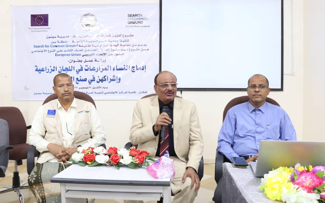 عقد صباح اليوم الاثنين 06ديسمبر بمدينة سيئون ورشة عمل بعنوان ” إدماج النساء المزارعات في اللجان الزراعية وإشراكهن في صنع القرار “. التي تأتي ضمن مشروع تعزيز قدرات النساء المزارعات بمديرية سيئون الذي تنفذه جمعية البدر النسوية التنموية بمنطقة بور ، بدعم من منظمة البحث عن أرضية مشتركة وبتمويل من الإتحاد الأوروبي .