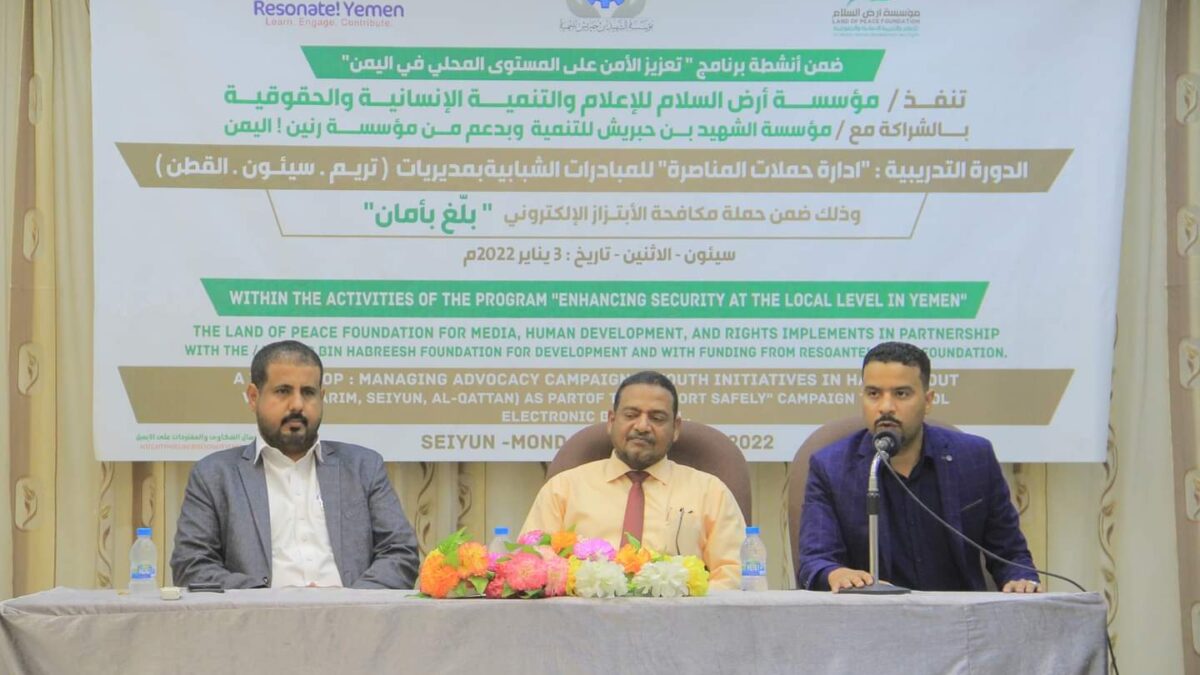 ضمن انشطة برنامج تعزيز الامن على المستوى المحلي في اليمن نفذت مؤسسة أرض السلام للإعلام والتنمية الإنسانية والحقوقية بالشراكة مع مؤسسة الشهيد بن حبريش للتنمية تمويل مؤسسة رنين !اليمن دورة تدريبية في “إدارة حملات المناصرة” للمبادرات الشبابية بمديريات سيئون تريم والقطن وذلك ضمن حملة مكافحة الابتزاز الإلكتروني “بلغ بأمان”.