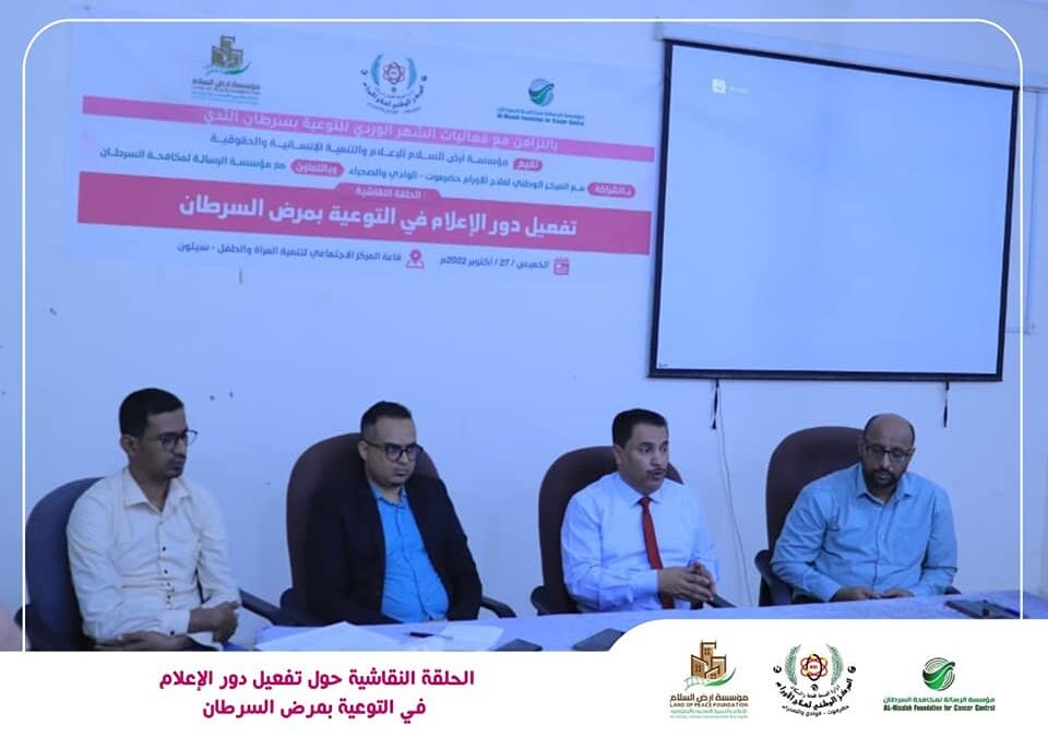 2022-11-02نظمت مؤسسة أرض السلام للإعلام والتنمية الإنسانية والحقوقية هذا اليوم الخميس 2022/10/27م حلقة نقاشية بعنوان ” تفعيل دور الإعلام في التوعية بمرض السرطان”.