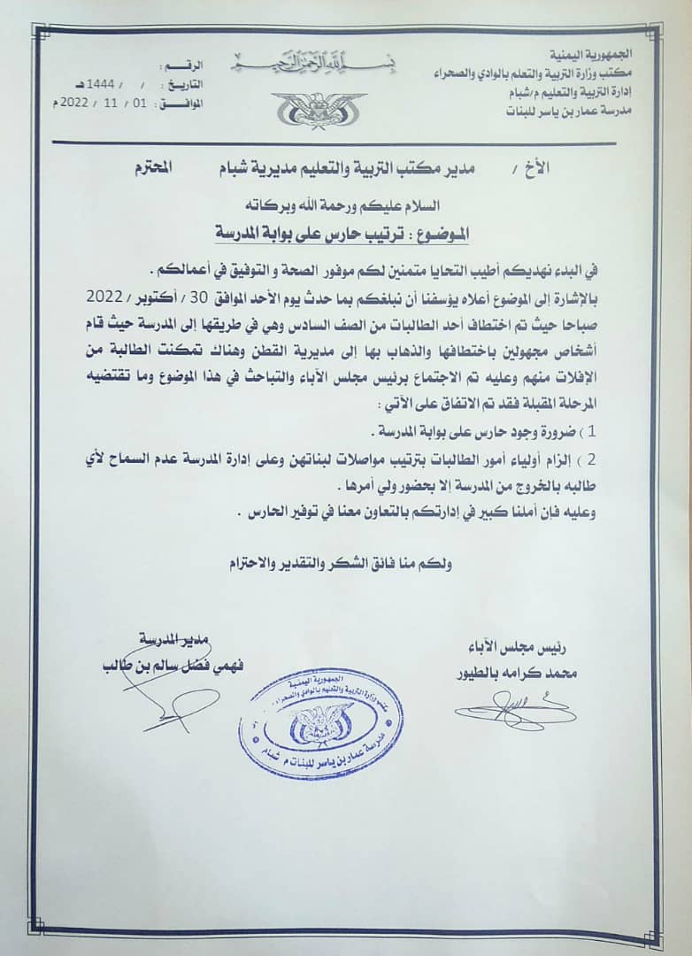 محاولة اختطاف طالبة بمديرية شبام بحضرموت (صورة + تفاضيل)