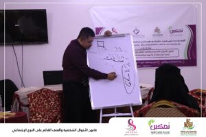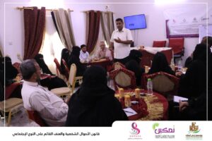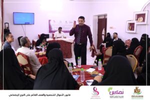 حيث استعرض في الورشة المحامي طاهر باعباد المواد القانونية والحقوق التي كفلها للمرأة في شتى الجوانب في قانون الاحوال الشخصية واليات المطالبة بها ونيلها في الاطر القانونية فيما استعرض المحامي صبري مسعود ظاهرة العنف القائم على النوع الاجتماعي من خلال التعرف على مفهوم العنف وأسبابه وأنواعه وكذا الأثار التي يتركها بضحاياه وكيفية معالجة هذه الظاهرة والحد من انتشارها. مؤكدين في حديثهما اهمية ادراك جميع النساء حقوقهن وواجباتهن التي تمكنهن من نيل حياة كريمة وتساهم في الحد من العنف الممارس ضد بعض النساء في اوساط المجتمع.