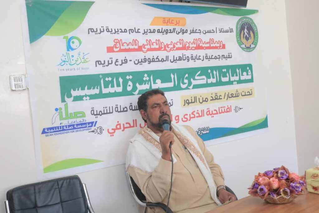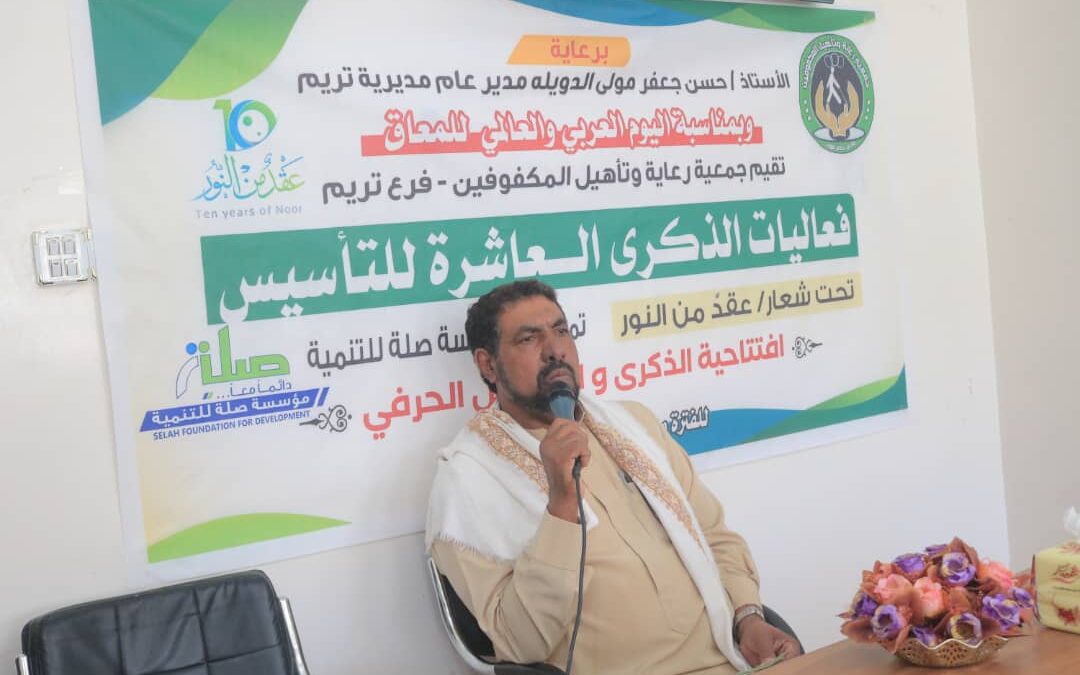 بحضور مدير عام مديرية تريم الأستاذ حسن جعفر مولى الدويلة، والأستاذ محمد عبدالله باشعيب مدير مكتب الشؤون الاجتماعية والعمل بمديرية تريم، والأستاذ أحمد بارفيد مدير مكتب التربية والتعليم، وبرعاية كريمة من مؤسسة صلة للتنمية، دشَّنت جمعية رعاية وتأهيل المكفوفين/ فرع تريم، فعاليات احتفالها بالذكرى العاشرة لتأسيس فرع الجمعية، والتي جاءت تحت شعار: (عقدٌ من النور) وتزامنًا مع احتفالات العالم باليوم العالمي والعربي للمعاق الثالث والثالث عشر من ديسمبر، وذلك بافتتاح المعرض الحرفي للمكفوفين والكفيفات.