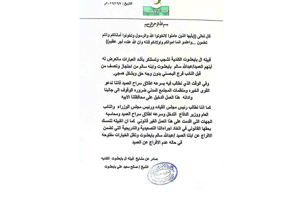 وقد أصدرت القبيلة بيان أدانت فيه ما تعرض له أبنهم العميد / عبدالله سالم بايعشوت وابنه من احتجاز وتعسف وصفته – بالهمجي – من قبل نائب رئيس المجلس الرئاسي.