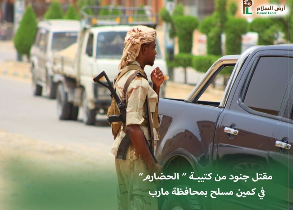مصدر عسكري اوضح لـ”منصة أرض السلام” بأن مسلحين مجهولين استهدفوا طقمين تابعة لكتيبة المهام الخاصة بالمنطقة العسكرية الأولى اثناء مهمة مرافقتهم لوفد لمنظمة الهجرة الدولية الى محافظة مارب وسط اليمن.