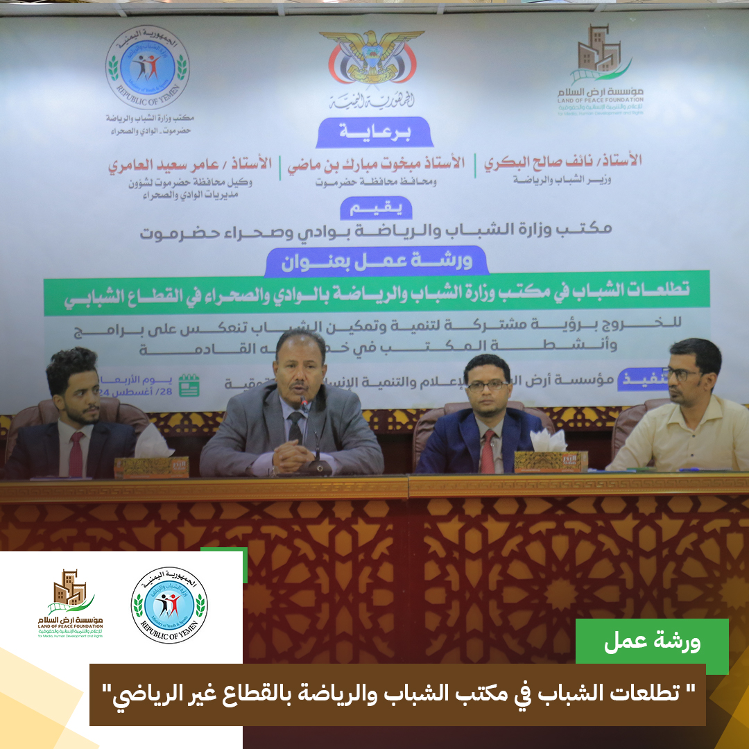 بتنفيذ مؤسسة أرض السلام .. ورشة عمل حول “تطلعات الشباب في القطاع غير الرياضي” بحضرموت.
