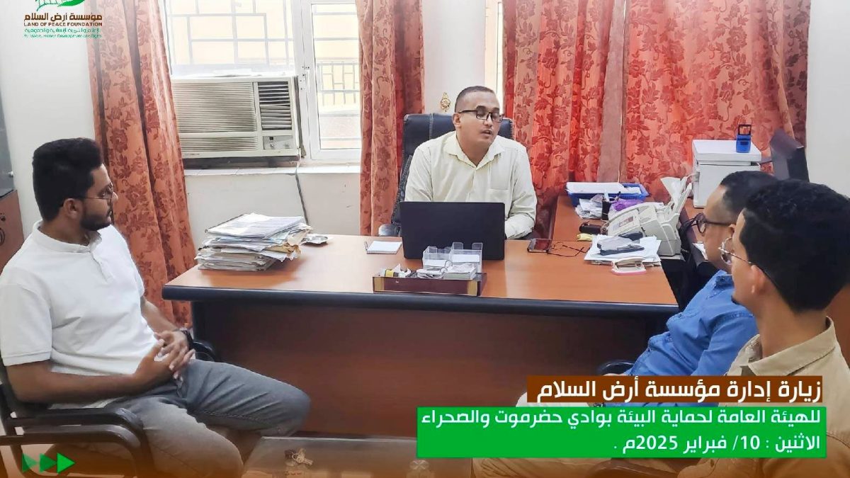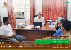 التقى صباح اليوم الإثنين مدير عام الهيئة العامة لحماية البيئة بوادي حضرموت والصحراء الاستاذ عمر محمد بن شهاب بإدارة مؤسسة أرض السلام بمكتبه بالمجمع الحكومي بمدينة سيئون.