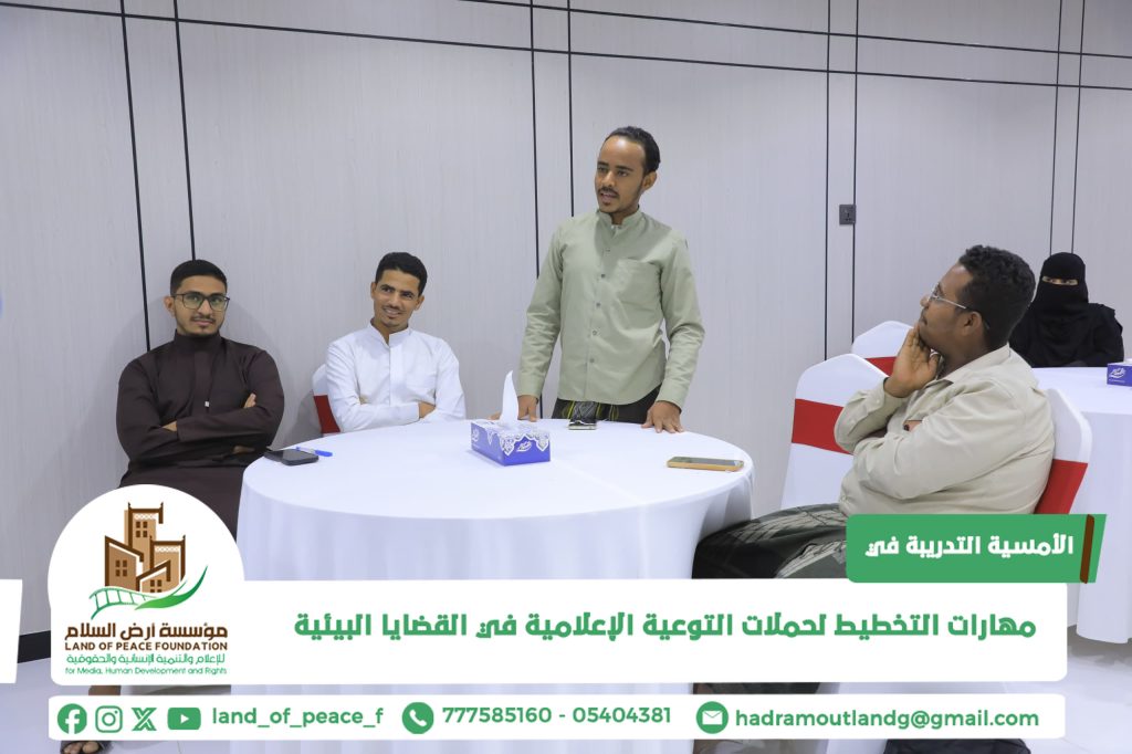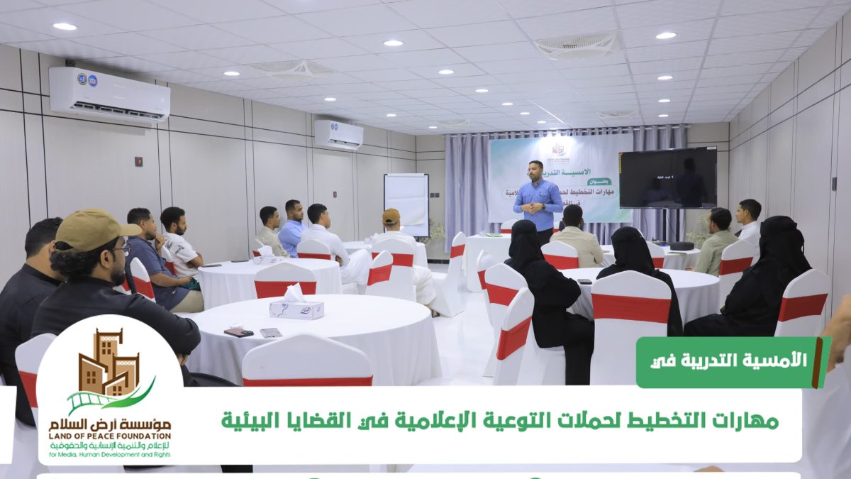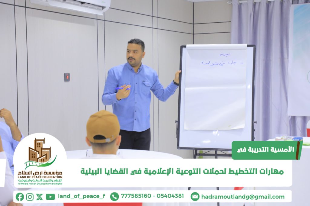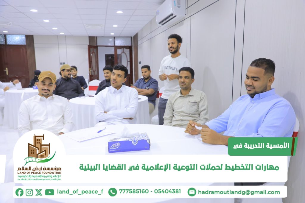 نظّمت مؤسسة أرض السلام للإعلام والتنمية الإنسانية والحقوقية أمسية تدريبية بعنوان “مهارات التخطيط لحملات التوعية الإعلامية في القضايا البيئية”، استهدفت عددًا من الناشطين والناشطات في وادي حضرموت.